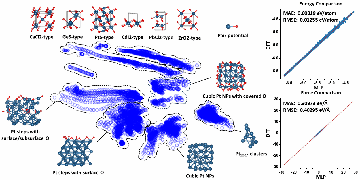 大连理工大学高峻峰教授团队长期致力于发展高精度、高效率的机器学习力场及主动学习策略,并将其应用于新材料预测、生长机理及表界面催化过程等研究。在本工作中,高峻峰教授与常远博士后构建了涵盖铂单质、不同氧化程度的铂台阶面、PtO团簇及多种PtO单晶表面模型,通过DFT计算生成了包含约16万组结构‑能量‑力对应关系的数据集,并以此训练出能够准确描述Pt-O体系相互作用的机器学习力场。