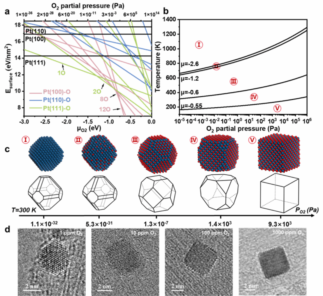 图2. a.Pt表面能随氧化学势变化。b.Pt纳米颗粒P-T曲线。c. Pt颗粒中间体wulff构造。d. 实验TEM图像