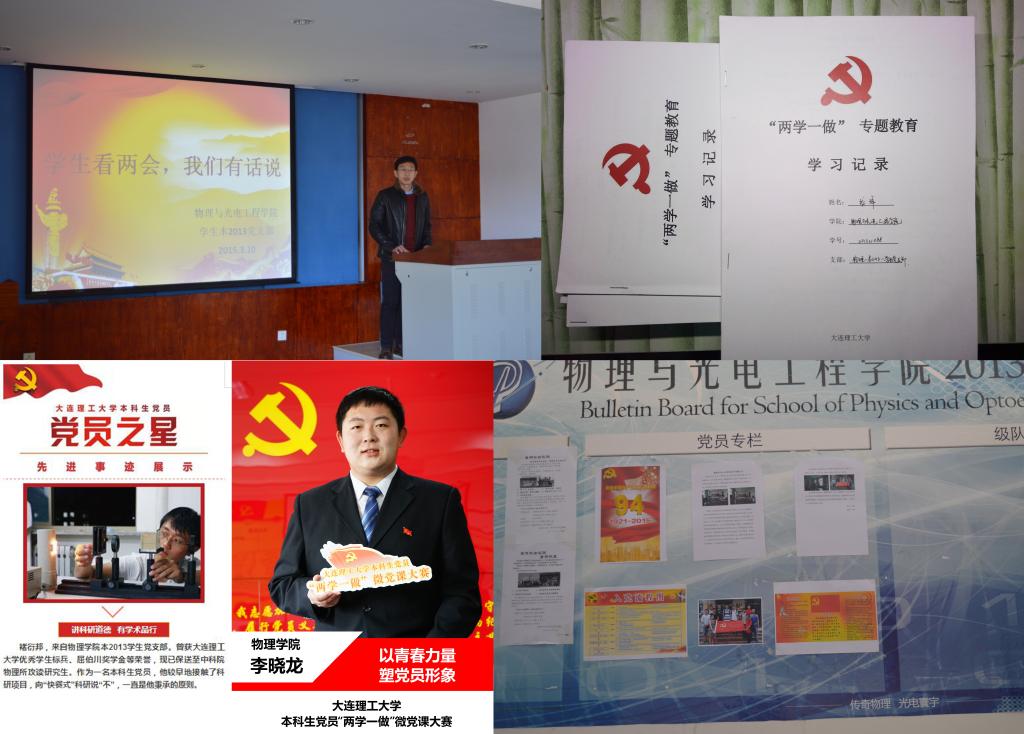 为积极响应党中央号召,该支部结合自身特点,开展了各类专题学习活动。在全国推进“三严三实”专题教育之时,支部书记率先提出要开展支部建设调查。通过走访等形式,了解支部建设和党员自身存在的问题,并开展支部内部批评和自我批评,制定《党员量化考核标准》,塑造党员模范新形象。在开展“两学一做”专题学习之际,支部积极推进学习工作。为更好地开展学习工作,支部书记参加了全国大学生党员“两学一做”培训班。同时,支委召开会议,理解系列教育学习精神,制定了《物理本13学生党支部“两学一做”学习方案》,并且成立了支部督导小组。利用党员大会,解读学习安排。2016年12月,支部李晓龙同志代表获“大连理工大学本科生两学一做微党课大赛”二等奖。