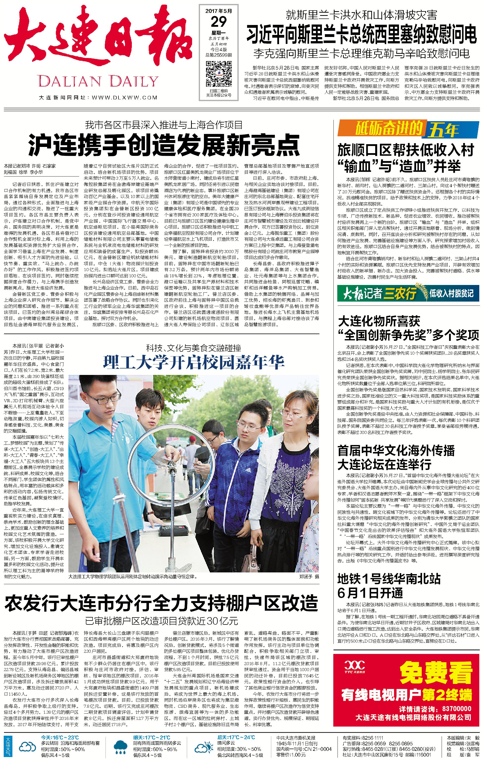 5月29日的《大连日报》,以我院科技展区图片为头版对嘉年华情况进行了报道。