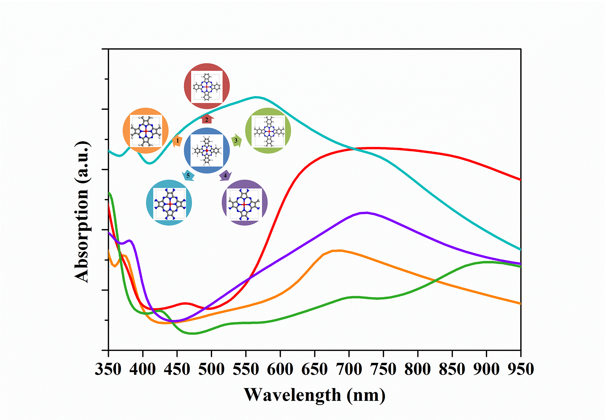第一性原理方法证实了上述设计思路。赵纪军教授课题组以锌酞菁为基本构造单元,自组装构造和评估了八种代表性二维锌酞菁基有机晶体材料的结构、电子和光学性能。同时,为了调控其最优表现,包括苯环的引入、原子掺杂、异质结设计等多种方案被设计和甄选。其中,3种特定构型的二维锌酞菁基有机晶体材料的器件可行性、光吸收特性以及能级位置满足有机太阳能电池的设计参数,获得了最高14.04%的理论能量转化效率,超过了目前已经证实的有机太阳能电池效率的最高值。