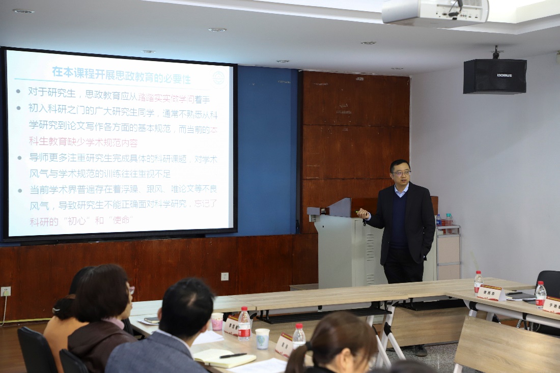 乐动官方网页版院长赵纪军在会上做《“学术规范与写作”校级课程思政示范课经验介绍》报告,结合“弘扬科学精神、提升学术品味、普及学术规范、恪守学术道德”四个课程核心理念,详细讲解了该门课程的主要内容与目标效果。