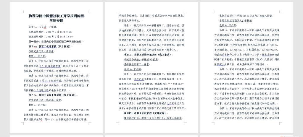 3月13日,学院党委接到教师工作部演练通知后,第一时间确定工作筹备队伍,明确了负责人(党委书记王正汹、党委副书记于艳敏)和参与人员,结合通知(含3月15日修订内容)中所提到的若干情况,编写了包括21个场景在内的演练脚本,按照学院工作实际分配角色。