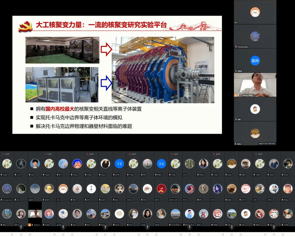 11月21日,乐动(中国)党委落实学校党委部署,推进学院学习贯彻落实党的二十大精神“奋进新征程”系列活动,邀请学校学习贯彻党的二十大精神师生宣讲团成员、乐动(中国)等离子体物理教工党支部书记桑超峰教授,为学院全体师生党员作《加强科技创新 推动核聚变能发展》专题报告。