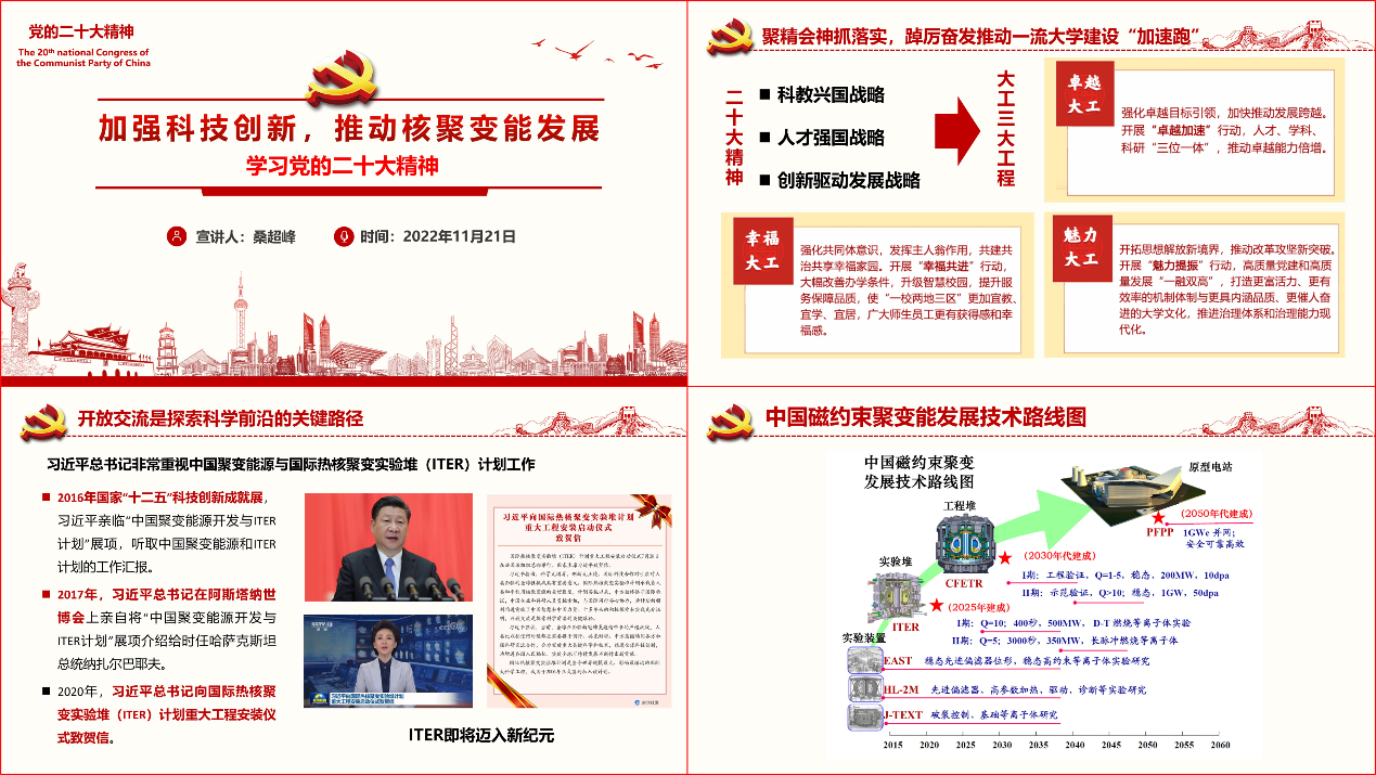 本次专题报告活动通过线上线下结合的方式开展,覆盖乐动(中国)全体师生党员。学院领导班子成员、党委委员、各党支部书记现场参加,学院党委书记王正汹主持活动并讲话,表示大科学计划是人类开拓知识前沿、探索未知世界和解决重大全球性问题的重要手段,我们在借鉴ITER经验的基础上,提出牵头组织国际核聚变示范堆计划方案建议,并面向能源需求谋划我国磁约束核聚变能发展战略及路线图,勉励师生党员将党的二十大精神学到深处、落到实处,心怀高远志向,做好本职工作,凝聚“大工力量”,奋进时代征程。