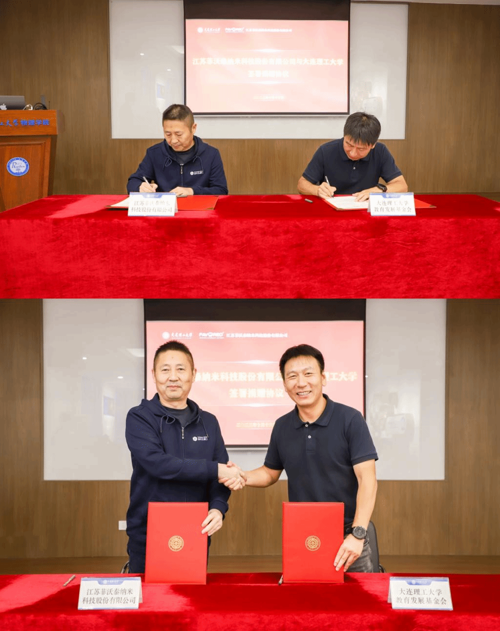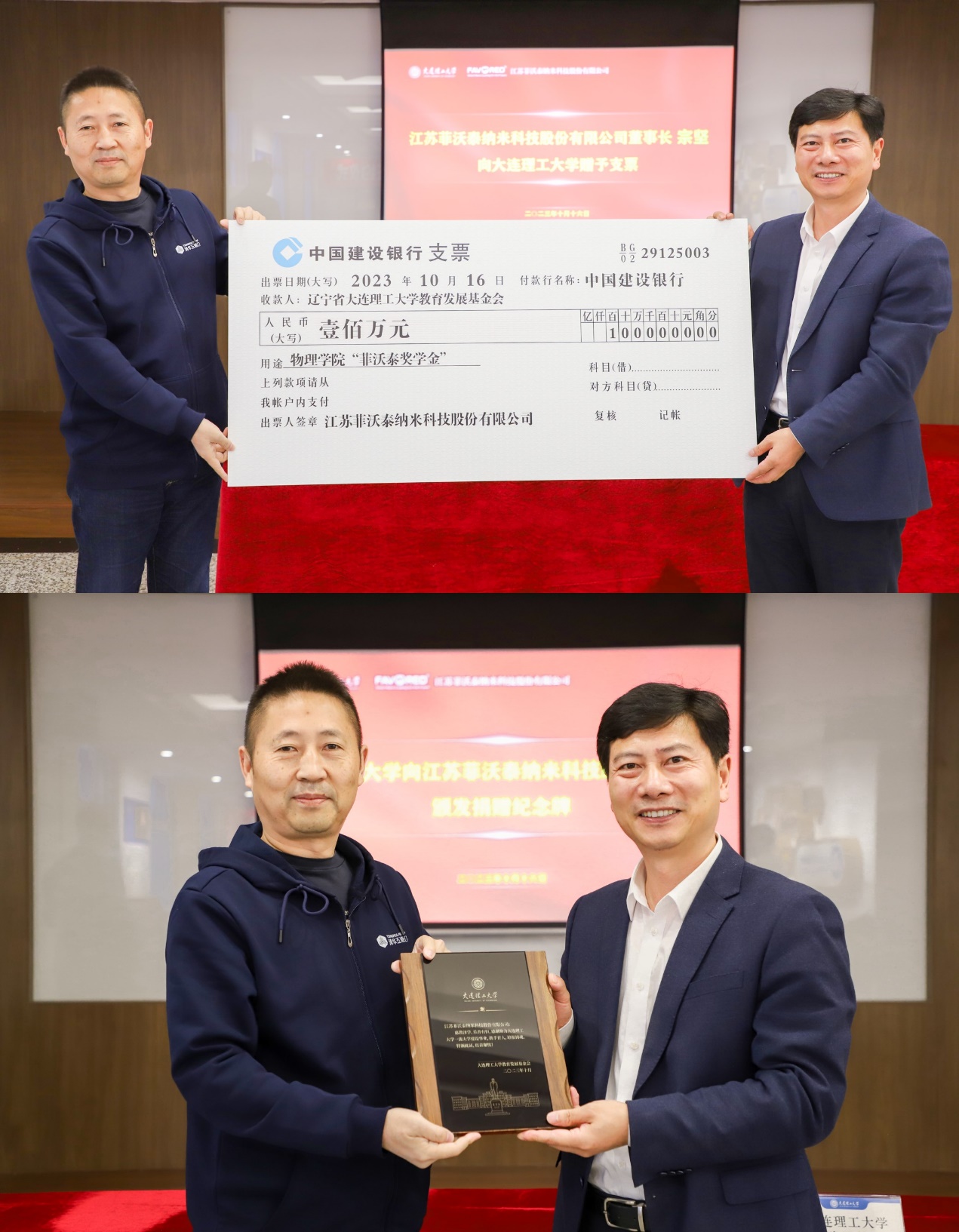 菲沃泰公司董事长宗坚与大连理工大学国内合作与联络处处长、教育发展基金会秘书长杨克旭签署捐赠协议。