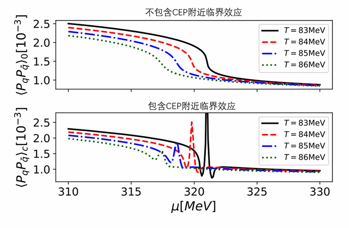 图2. 包含与不包含CEP附近临界效应时夸克-反夸克自旋关联的对比