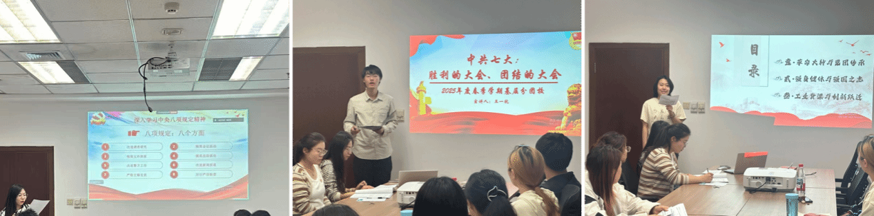 接下来,由学院团委组织部副部长王一杭作《中共七大:胜利的大会、团结的大会》主题演讲。王一杭同志以翔实的史料,生动讲述了中国共产党第七次全国代表大会在历史紧要关头召开的重大意义,深刻阐释了会议确立毛泽东思想为党的指导思想、提出“团结一致,争取胜利”方针的历史性贡献。王一杭同志用真实的历史,引导全体党员深刻领悟到“团结就是力量”这一穿越时空的真理,明确党的坚强领导和正确路线是事业成功的根本保证。随后,由学院优秀团课作品团队的刘泷带来主题为《大工筑梦新征程,青年奋进绘华光》的精彩演讲。刘泷同学紧密围绕新时代青年学子的责任与使命,结合大连这座城市的历史以及我校的优良传统,号召广大青年党员将个人理想融入强国建设、民族复兴的伟大征程,以奋发有为的精神状态和一往无前的奋斗姿态,在科技创新、社会服务、文化传承等广阔天地中施展才华、贡献力量。两场主题演讲,从历史走向当代,史料翔实、观点鲜明、激情澎湃,引发了与会党员的强烈共鸣与深入思考。