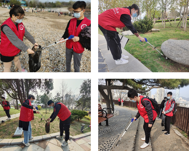 4月24日下午2:30参与本次活动的17名志愿者一起出发至星海浴场,到达目的地后,大家自主分工很快投入到劳动当中。志愿者们兵分三路,沿三个方向分头行动,首先将公园里面游览道路、休闲小亭、草坪上存在的的烟头,食品包装袋等垃圾收集起来,之后又到海滩边清理留下的垃圾。每个小组分工协作,有条不紊,有人拿着垃圾夹,有人拿着垃圾袋,不放过所到之处的任何一个垃圾。