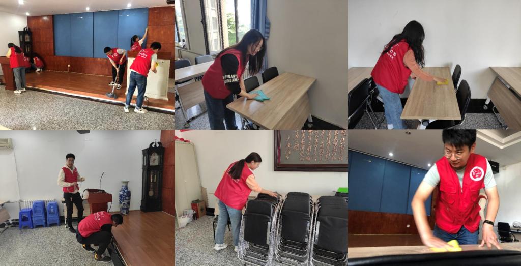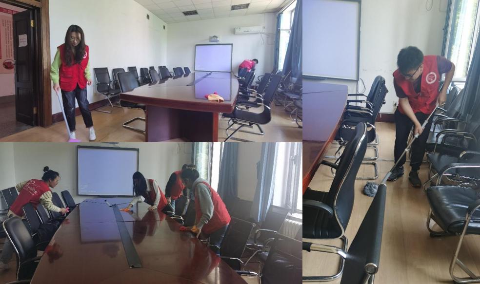 为了不影响相关会议室的正常使用,5月14日中午11:30,参与本次活动的23名志愿者利用午休时间在322会议室集合。简短的动员布置会后,大家快速地投入到了劳动当中。志愿者们分为三组,分别清扫整理322,422,425会议室,每个小组通过分工协作,有条不紊快速高效地开展工作。