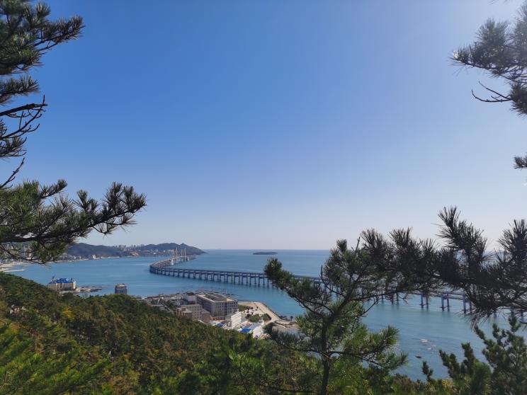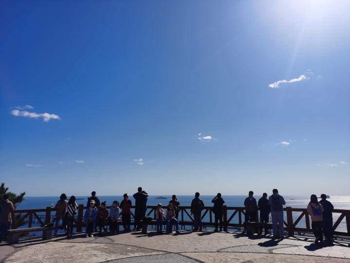 上午八点半全体成员在物理楼集合出发,一路南行,丛书林教授向研一新生介绍了学校的标志性建筑。水杉树林下,向学生们讲述了有关水杉树的生长知识,到达南门时,大家合影留念。老师和同学们沿着凌水路相携步行,通过黄浦路天桥,穿过凌河街,再走过国家海洋环境监测中心,便到达西尖山脚下。西尖山南临大海,水天一色,于是大家从到达山脚下开始便被美景拖慢了脚步,走走停停。