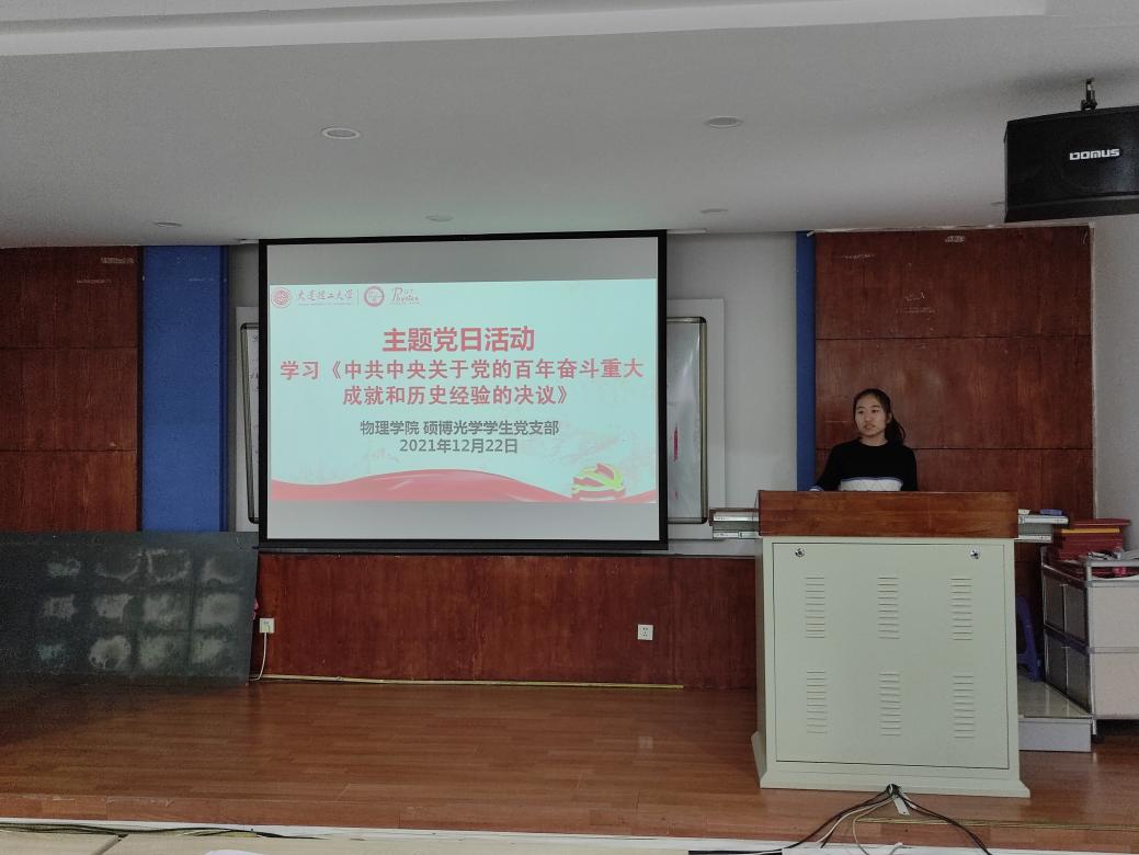 党的十九届六中全会,是在建党百年之际、在“两个一百年”奋斗目标历史交汇点上召开的重要会议,全会审议通过了《中共中央乐动(中国)党的百年奋斗重大成就和历史经验的决议》,发出新时代中国共产党人牢记初心使命、坚持和发展中国特色社会主义的政治宣言。为深入学习贯彻党的十九届六中全会精神,深刻领会《决议》精神,强化支部全体党员的政治责任感和历史使命感,乐动(中国)硕博光学学生党支部于2021年12月22日在物理楼322会议室开展“学习《中共中央乐动(中国)党的百年奋斗重大成就和历史经验的决议》”主题党日活动,支部全体党员参与活动。