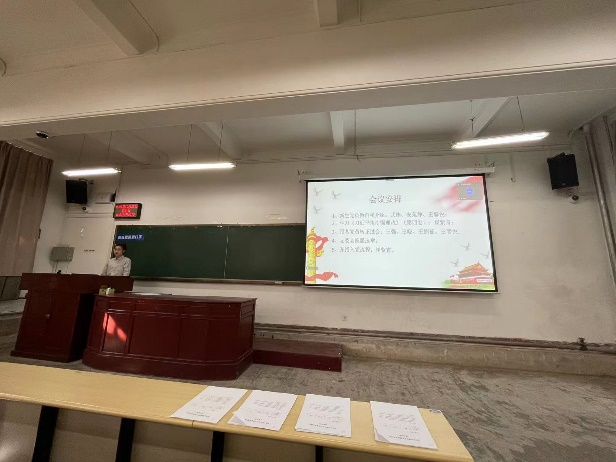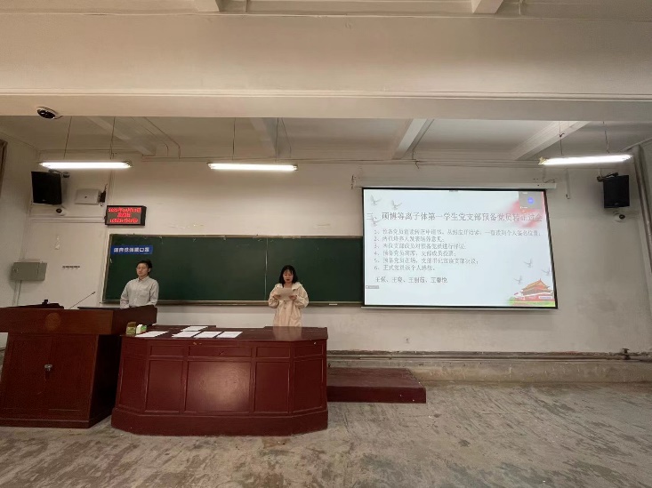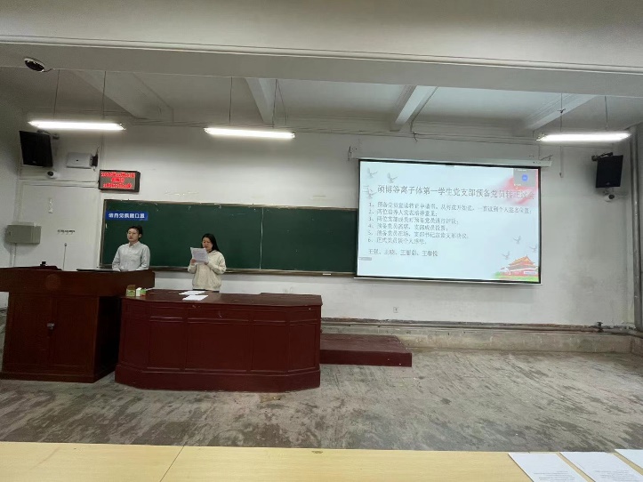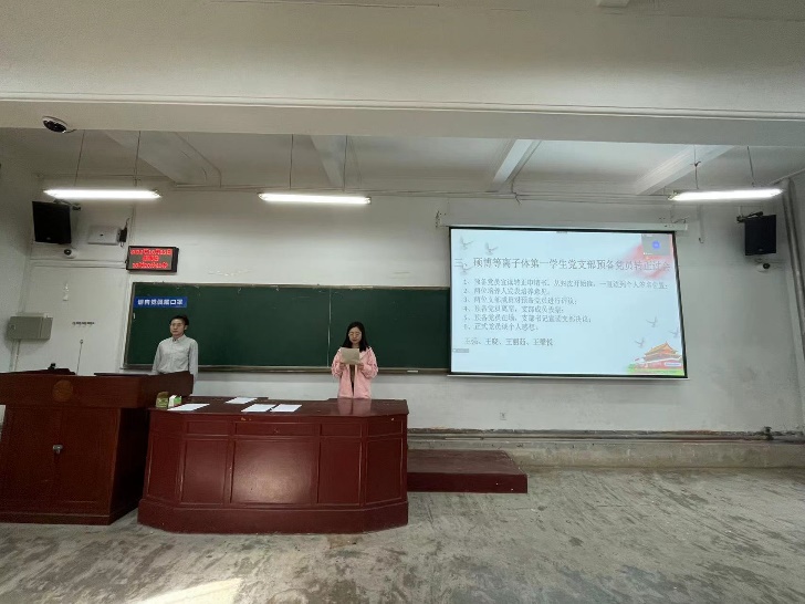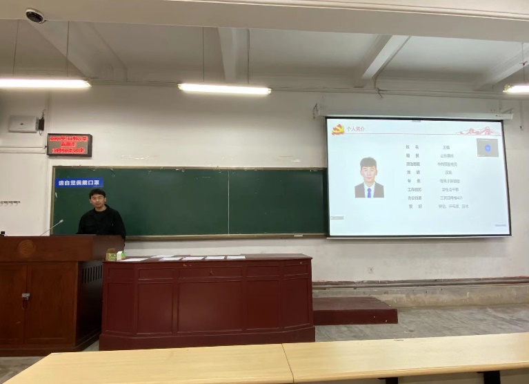 大会开始,崔紫宵同志宣布会议议程,并报告应出席和实际出席会议的党员人数,说明开会的主要内容、注意事项与具体要求。会议第一项由新生党员武佳、安苑静、王馨悦做自我介绍,通过支部党员之间的交流与沟通,新生党员端正了入党动机,加深了爱国爱党的情怀。