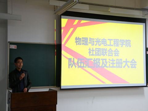 物理与光电工程学院社团联合会队伍汇报及注册大会于12月18日在西部综合楼B106教室召开。校社团联合会指导老师冯丽芳老师,物理与光电工程学院团委书记佟西原老师,校社团联合会副主席郑晶,李冠基,电子信息与电气工程学部社团联合会主席全欣,建设工程与力学学部社团联合会主席耿冲,乐动(中国)学生会主席兼团委副书记刘聪越,乐动(中国)团委常务副书记金美晨以及乐动(中国)团委,学生会,社团联合会的各部长出席会议,由乐动(中国)社团联合会主席孙长鹏主持会议。